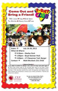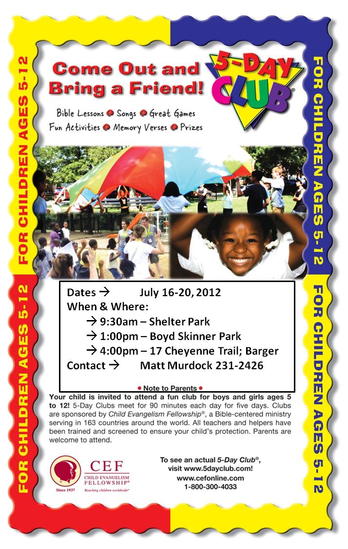 From July 16-20, Church of the Res will be sponsoring Child Evangelism Fellowship to run a 5-day kids’ club. They will be meeting in 3 separate locations at 3 different times the entire week. On Friday evening we will have a BBQ for all the kids and their parents. Please be sure to share this with anyone who may have kids, it;s going to fun & profitable!