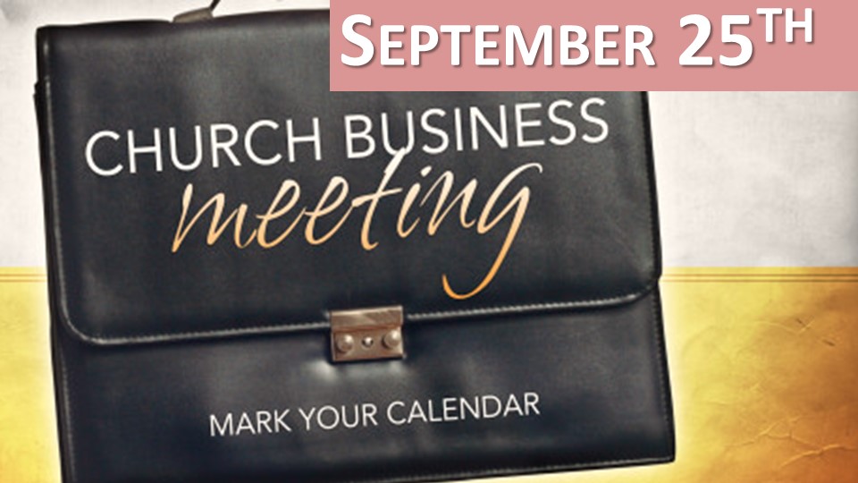 September 23, 2016 Church Business Meeting Share this: Click to share on Facebook (Opens in new window) Facebook Click to share on LinkedIn (Opens in new window) LinkedIn Click to email a link to a friend (Opens in new window) Email Click to print (Opens in new window) Print Like Loading... Related
